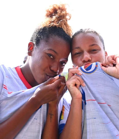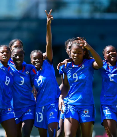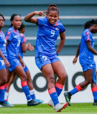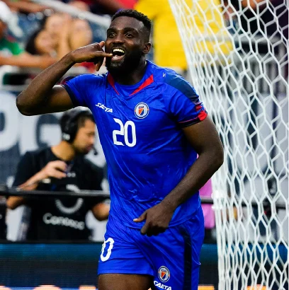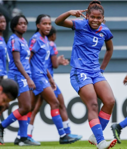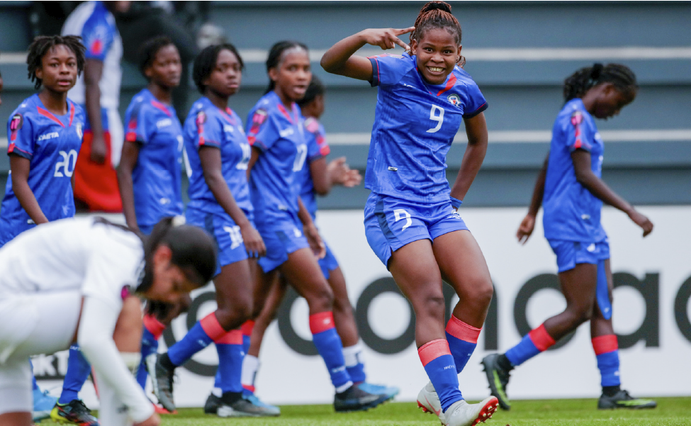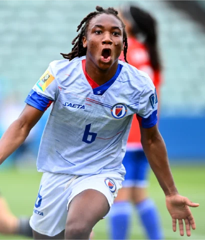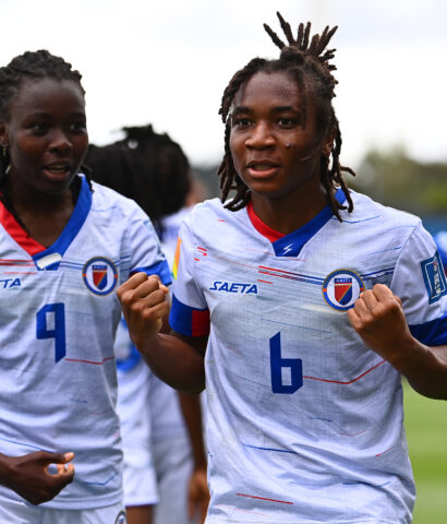 AUCKLAND, NEW ZEALAND – FEBRUARY 22: Melchie Dumonay of Haiti celebrates scoring her team’s first goal during the 2023 FIFA World Cup Play Off Tournament match between Chile and Haiti at North Harbour Stadium on February 22, 2023 in Auckland, New Zealand. (Photo by Hannah Peters – FIFA/FIFA via Getty Images)